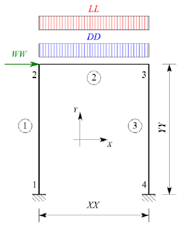 The study introduced additional randomness to the cross-section area and moment of inertia of the canonic Haldar-Mahadevan portal frame illustrated in Figure 2 [16]. Stochastic behavior was also applied to the beam span, column height, and the limiting horizontal displacement of the frame. In addition, a Weibull extreme value distribution function (Type III smallest) was established for the live load (LL) and wind load (WW), as shown in Table 1. Thus, the proposed study expands Haldar and Mahadevan's canonical framework approach by including seven new random variables. Figure 2 shows the simulated frame's geometric configuration, constraints, and loads.