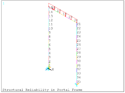 The frame model in Figure 4 is discretized into 35 BEAM3 finite elements. This element can support loads in tension, compression, and bending and has three degrees of freedom per node for x-translation, y-translation, and z-rotation.