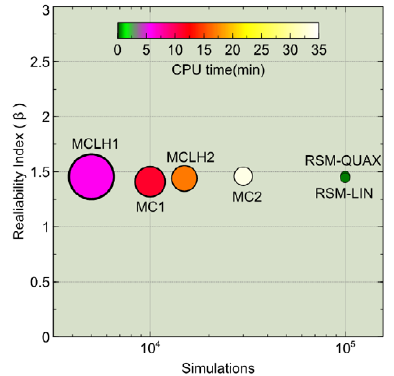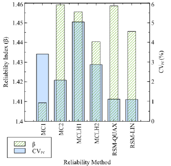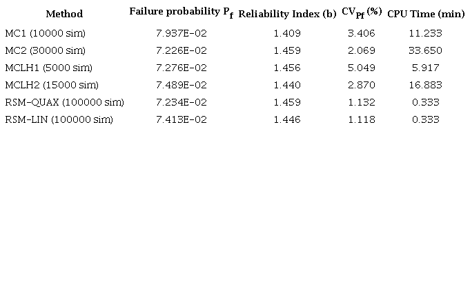 The most advantageous method is the RSM. A significant reduction in computational cost is achieved by replacing the finite element model with a polynomial obtained from experimental design and regression. With just 20 seconds of CPU time, up to 100,000 simulations can be performed with highly satisfactory results in structural reliability. A coefficient of variation of failure probability close to 1% is considered accurate, and coefficients below 3% are recommended.