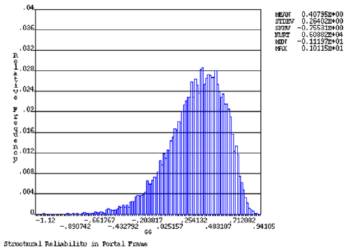 Figures 7 to 10 show the approximate distribution of the gg(X) limit state function calculated with the MC2, MCLH2, RSM-QUAX, and RSM-LIN versions through histogram plots. The service limit state function, gg(X), is denoted as GG, hereafter.