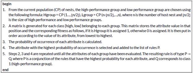 In this research, the algorithm proposed in [23] carries out the machine learning process, which is responsible for the rule inference process. The latter defines a set of conjunctive rules (P←R1 ∧R2 ∧…∧Rn ) that delineate the regions where there is a greater chance of finding a better value for each dimension xi (for example LVxi ≤ xi ≤ HVxi; here, LV and HV are the lower and upper limits of the rules for the value on dimension). Given the combination of rules (R) for each dimension, the search space is limited to regions most likely to generate a global optimum. The rule inference process is run for the first time immediately after creating the initial population of nests. The steps of the rule inference process are summarized in Figure 1.