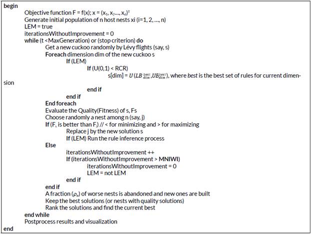 Inspired by the concept of Learnable Evolution Models (LEM) proposed by Michalski [21][22], a new version of the Cuckoo Search (CS) algorithm is proposed in this section. In LEM, machine learning techniques are used to generate new populations along with the Darwinian method, applied in evolutionary computation and based on mutation and natural selection. This method can determine which individuals in a population (or set of individuals from previous populations) are better than others in performing specific tasks. This reasoning, expressed as an inductive hypothesis, is used to generate new populations. Then, when the algorithm is running in Darwinian evolution mode, it uses random or semi-random operations to generate new individuals (employing traditional mutation or recombination techniques).