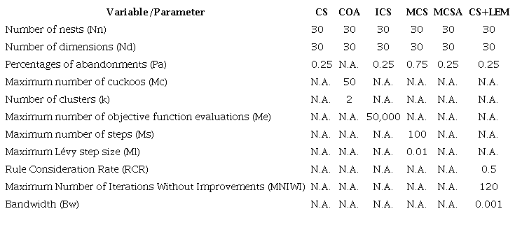 This section shows the performance of cuckoo-inspired algorithms in three different assessments, namely: 1) the optimal value achieved with a fixed time of execution; 2) the number of objective function evaluations required to reach the global optimum; and 3) the optimal value achieved with a fixed number of Objective Function Evaluations (OFE). Previously used parameters for executing all algorithms in each experiment are presented in Table 1. The parameters for all algorithms were used based on values recommended by their original authors. The approach of different challenges in optimization problems was used in our work. Therefore, the parameter values were the same for all optimization problems, i.e., there was no tuning of parameters conducted for each algorithm in each specific problem.
