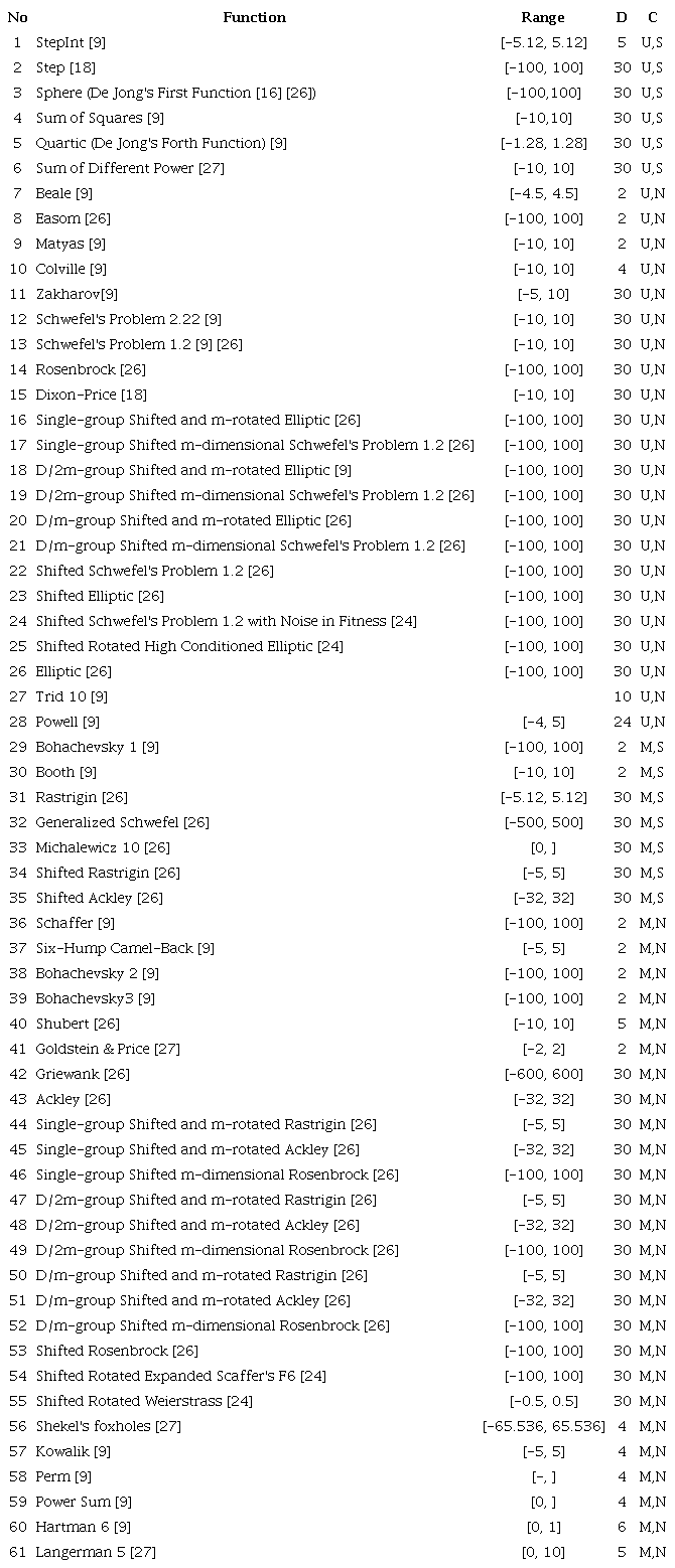 Table 2 shows 6 unimodal separable functions, 22 unimodal non-separable functions, 7 multimodal separable functions, and 26 multimodal non-separable functions. They are based on those proposed in the report "Benchmark Functions for the CEC'2010 Special Session and Competition on Large-Scale Global Optimization" [24][25][26] and the paper "A comparative study of Artificial Bee Colony Algorithm" [9], which provides an adequate range of complexity levels. For each function, the global minimum is searched.
