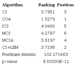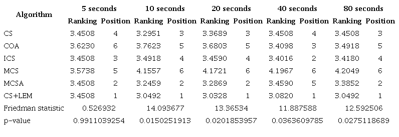 The Friedman test shows that CS+LEM is the best option for solving problems when the designer does not know anything about the landscape of the fitness function, the problem has high dimensionality, and the execution time is short (lower than 80 seconds) (see Table 3). General results based on the Wilcoxon non-parametric test with a 0.95 significance level also show that: 1) At 5s, CS+LEM outperforms COA, MCS, and MCSA, and ICS and MCSA outperform COA and MCS; 2) At 10s and 20s, CS+LEM outperforms all other algorithms, and MCSA outperforms CS, COA, ICS, and MCS; 3) At 40s and 80s, CS+LEM outperforms all other algorithms and COA outperforms CS, ICS, MCS and MCSA.