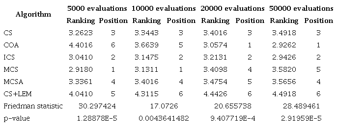 Results using Wilcoxon test (by default with a significance level of 0.95) show that at 5000 OFEs, MCS outperforms CS, COA, ICS, and CS+LEM, and ICS outperforms COA and CS+LEM; at 10000 OFEs, MCS outperforms CS, COA, ICS, and CS+LEM, and ICS outperforms COA and CS+LEM; At 20000 OFEs, COA and ICS outperform CS and CS+LEM, and COA outperforms ICS, MCSA, and CS+LEM [Wilcoxon significance level of 0.90]; at 50000 OFE - COA outperforms CS, CSA, and CS+LEM, and ICS outperforms CS and CS+LEM. It is essential to consider that this test is the least used by the research community since algorithms that spend much time calculating the changes in the current individuals to obtain the new ones have a clear advantage over those that spend less time.