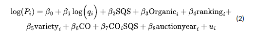 log(P): Natural logarithm of the price of coffee auctioned in US dollars per pound.
