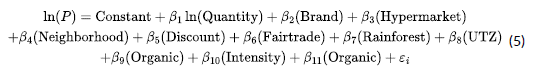 Merbah and Benito [14] collected a sample of 645 coffee packages sold across Spain’s five largest supermarket chains between September and October 2021. From this dataset, they used a set of variables such as brand, quantity, type of business where the coffee is sold, coffee intensity, origin, weather, and certifications; the model was based on the one proposed by Rosen. Equation 5 shows it, where β is a dummy parameter to estimate the implicit price; ε_i is an error value. Finally, they evaluated the model with R2 (0.77), adjusted R2 (0.77), and the F-score(0); therefore, the model presents homoscedasticity.
