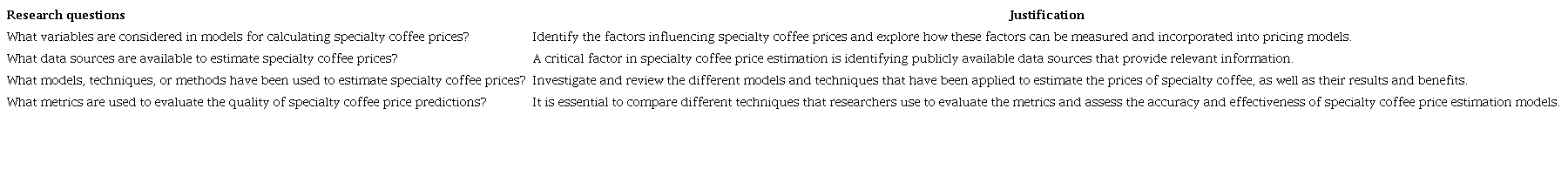 1) Search terms. A comprehensive set of search terms was used to gather relevant literature for this research, focusing on specialty coffee price estimation. To identify literature related to specialty coffee, we employed a variety of synonymous terms to cover the various aspects of the study. This search string included: ("specialty coffee" OR "premium coffee" OR "gourmet coffee" OR "high-quality coffee" OR "single-origin coffee" OR "certified coffee"). We also needed to capture different methodologies for estimating or calculating the price (intervention). Therefore, we included different terms related to various modeling and analytical techniques: (model OR technique OR algorithm OR function OR regression) and the word price with an AND operator. Finally, the resulting search string was constructed as follows to ensure comprehensive coverage of the topic: ("specialty coffee" OR "premium coffee" OR "gourmet coffee" OR "high-quality coffee" OR "single-origin coffee" OR "certified coffee") AND (model OR technique OR algorithm OR function OR regression) AND (price*). Moreover, the time period from 2008 to 2023 was considered.