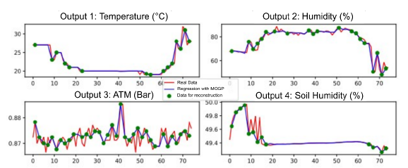 Figure 2 shows data modeling with MOGP for Frame 1. The red line corresponds to the real data of the WSN, the blue line to the regression with MOGP, and the green points are the data necessary for reconstruction, that is, it indicates the dimensionality reduction having a given RMSE.