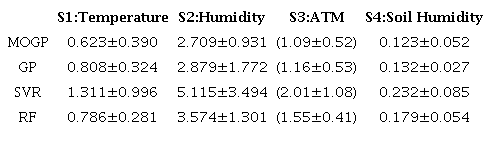 1) Analysis in terms of RMSE. Table 3 provides comparative results of the Root Mean Square Error (RMSE) for different machine learning methods (MOGP, GP, SVR, RF) applied to data from four sensors (S1, S2, S3, S4), each related to different environmental magnitudes (temperature, humidity, atmospheric pressure and soil humidity).