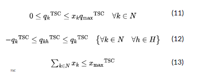where represents the maximum size permitted for a single TSC connected to bus 𝑘, whose location is defined by the activation of the binary variable xk; and is a constant parameter defining all the TSCs available for installation.