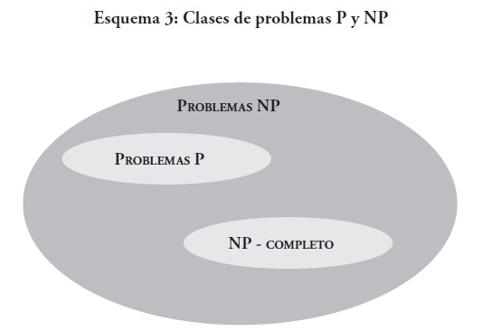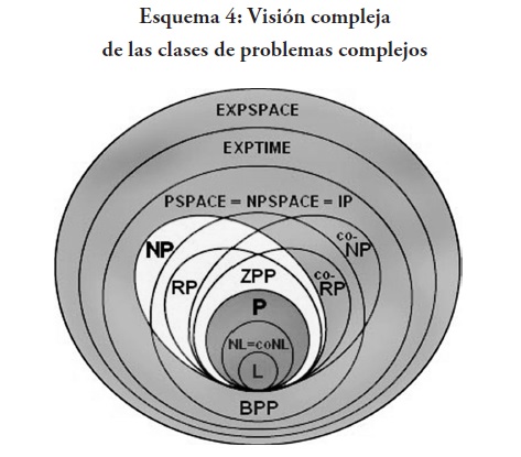 Pues bien, la forma de considerar los problemas complejos es mediante la clasificación de las clases de complejidad de los problemas de decisión. La clasificación más general son los problemas P versus NP (Fortnow 2013). El esquema 3 presenta esta clasificación: