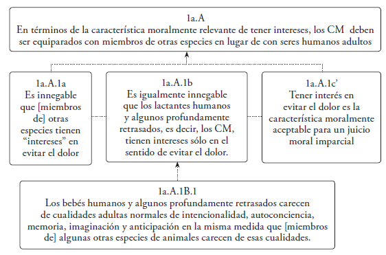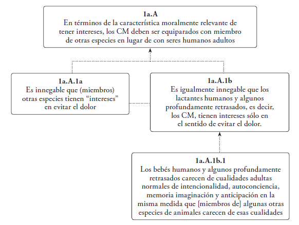 Con respecto al concepto de tener interés en evitar el dolor, los pasajes I y II inician con una fuerte apelación marcada por “es innegable...” y “es igualmente innegable…”. Pero la evidencia apelada depende de la aceptación del concepto de “tener intereses” en el sentido descrito y sin lo cual carece de sentido en III la idea de “equiparación” entre animales y casos marginales. Así que este concepto hace parte de una argumentación que se da por aceptada con anterioridad. El enunciado (1a.A.1c’) es una premisa implícita requerida para sustentar de manera coordinada con (1a.A.1a) y (1a.A.1b) el punto de vista en torno a la “característica moralmente relevante de tener intereses”, esto es, aceptar que la equiparación no corresponde a una descripción biológica o fisiológica en torno al dolor, sino al interés en evitar el dolor como criterio de juicio moral y equiparación del mismo sin importar condición o, en este caso, especie.