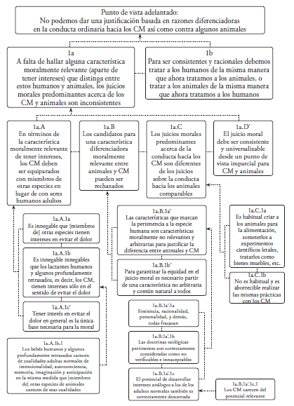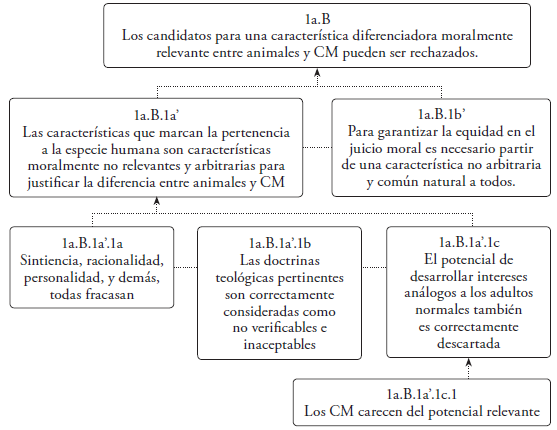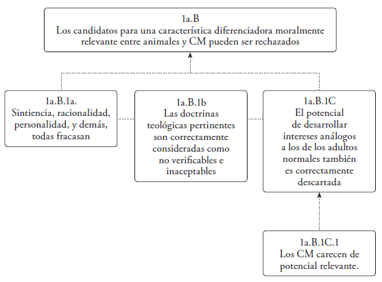 El argumento 1a.C es probablemente el menos problemático. El punto de vista defiende una diferencia en el juicio moral predominante acerca de la conducta hacia casos marginales y los animales. Las premisas básicas (1a.C.1a) y (1a.C.1b) establecen la diferencia habitual en el trato para cada uno. Sin embargo, al considerar el esquema argumentativo, el paso a la conclusión no es preciso. El esquema utilizado es de nuevo uno basado en una relación de analogía, pero en lugar de afirmar el parecido, establece la diferencia (no son comparables). Empero, los términos de comparación no son claramente los mismos. Mientras que las premisas establecen una diferencia en el trato habitual, la conclusión remite a una diferencia en el juicio moral predominante. Podría aclararse el razonamiento especificando que el “juicio moral habitual” hacia animales acepta un tipo de conducta y en cambio el juicio moral habitual rechaza la misma conducta para los casos marginales. Dada esta precisión al menos este aspecto del razonamiento adquiere coherencia. Pero aún hay otro aspecto: el punto de vista defendido supone que ya se ha establecido la comparabilidad entre casos marginales y animales. Aunque este problema podría omitirse en una interpretación de (1a.C), incide en la interpretación del argumento consecuente dirigido a (1a), pues supone que se ha establecido en una argumentación subordinada el criterio de comparabilidad, esto es, lo argumentado en (1a.A) y (1a.B), pero la estructura misma es controvertible en tanto el paso a (1a) demanda una argumentación coordinada de (1a.A), (1a.B) y (1a.C).