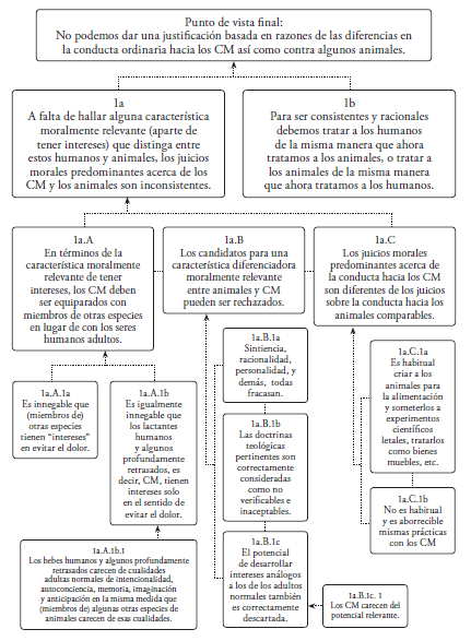 En este argumento se ponen en juego varios elementos de transfondo teórico e ideológico que median la aceptabilidad de las premisas básicas (1a.B.1a'.1a), (1a.B.1a'.1b) y (1a.B.1a'.1c). Estas premisas asumen la aceptabilidad de eliminar criterios de diferenciación entre animales y humanos, en la medida que tampoco aplicarían a los casos marginales.