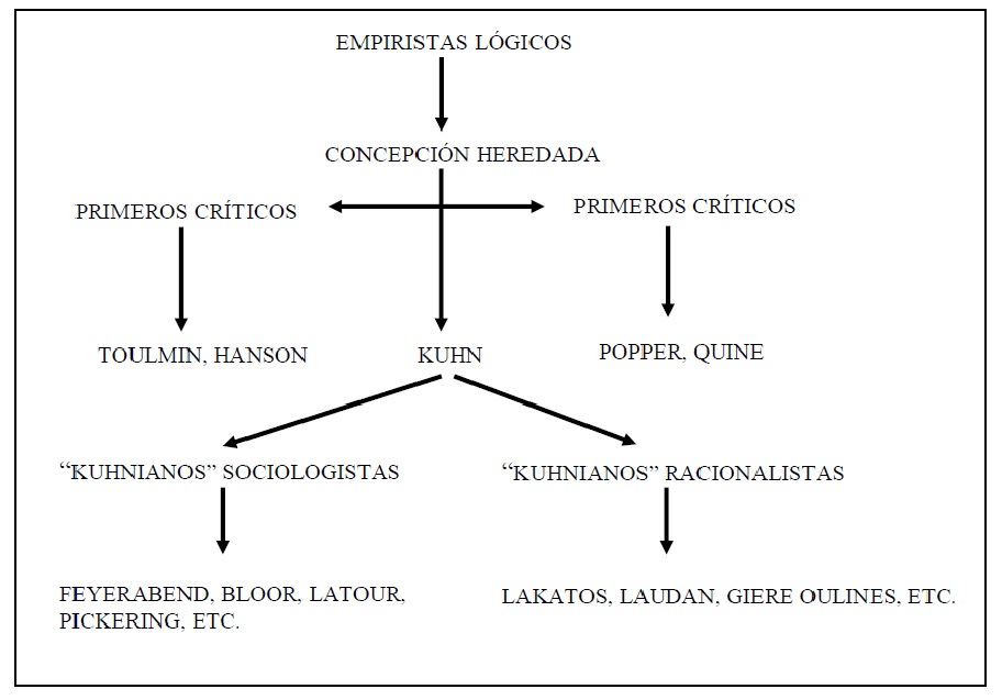 Todas ellas habían asumido en mayor o menor medida la esencial relatividad del conocimiento científico con respecto a las condiciones culturales, sociales o económicas de cada época, si bien esta asunción se había llevado a cabo más a partir de una posturas filosóficas determinadas que mediante un estudio sistemático de la historia de la ciencia.[12] Dentro de este contexto, el empirismo lógico tuvo la suerte de ganar la adhesión de la mayor parte de los filósofos de la ciencia de Estados Unidos inmediatamente después de la Segunda Guerra Mundial, pero ni mucho menos puede llegar a considerarse como una “ortodoxia” temporal en la historia de la Filosofía de la Ciencia. Así, una representación gráfica medianamente realista de dicha historia en la segunda mitad del siglo xx sería, por lo tanto, mucho más confusa que la que se muestra en la figura 1, pues contendría numerosos enfoques más o menos relacionados entre sí, y tan mezclados en algunos puntos que sería difícil reconocerlos como escuelas autónomas.