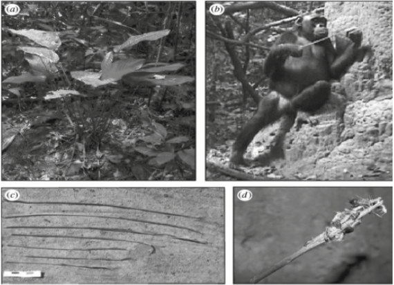 Desde el campo de la primatología, algunos estudios de caso han resaltado la sorprendente habilidad de los chimpancés africanos (pan troglodytes) y macacos japoneses (macaca fuscata) para fabricar y usar pequeños palos para extraer termitas de un termitero (Goodall 1964). Por su parte, otros estudiosos sugieren que la habilidad técnica de los animales no es una habilidad aprendida sin más, sino que ésta se debe a idiosincrasias culturales propias de cada una de las comunidades de los animales (McGrew 1992; McGrew y Tutin 1978; McGrew, Tutin y Baldwin 1979; Whiten et al 1999). Al respecto, en una serie de observaciones los investigadores Crickette Sanz, Josep Call y David Morgan comprobaron que los chimpancés (Pan troglodytes) salvajes del Triángulo de Goualougo (República del Congo) son capaces de utilizar herramientas de diversas formas para extraer termitas de un nido (Sanz, Call y Morgan 2009). De acuerdo con las observaciones, los chimpancés utilizaban como herramienta los tallos de una planta conocida como marantaceae. En algunas ocasiones, los chimpancés solamente utilizaban un tallo. En otras ocasiones, los chimpancés utilizaban un tallo duro y otro más laxo para extraer termitas. También se observó que los chimpancés modificaban la herramienta antes usarla. En este caso, las herramientas sufrían pequeñas modificaciones pues los chimpancés mordisqueaban un extremo del tallo para hacer puntas deshilachadas que luego introducían en los nidos para pescar termitas.
