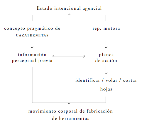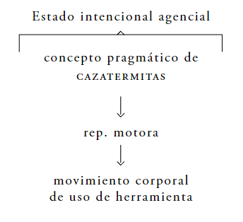 El anterior esquema sintetiza mi idea acerca de los elementos causales implicados en el uso de la herramienta. Digo entonces que el uso de herramientas fue causado por el estado intencional agencial compuesto por el concepto pragmático de CAZATERMITAS y de las representaciones motoras que son causa y también son guía del movimiento corporal. En primer lugar, los conceptos pragmáticos almacenan información perceptual acerca del entorno y los objetos percibidos en éste. En este caso, la identificación de la planta marantaceae entre el follaje fue posible gracias al despliegue de dicho concepto. Pero, la identificación perceptual no es suficiente para explicar la conducta de uso de herramientas, sobre todo, lo concerniente al movimiento corporal del animal. Para ello, las representaciones motoras se hacen necesarias para explicar dicho movimiento. En segundo lugar, las representaciones motoras representan los objetivos de la acción (termitas) y monitorean/guían la acción para que esta se ejecute de manera adecuada para lograr dicho objetivo. De esta manera, las representaciones motoras cumplen una función de antecedente causal y guía de los movimientos corporales de uso de herramientas (pinchar los túneles ya hechos para atraer a las termitas u oler la herramienta para saber si hay termitas en el nido). ¿Pero, por qué son necesarios acudir a estos dos elementos? La necesidad de combinar estos dos elementos conceptuales radica en que éstos son buenos complementos explicativos. El conceptos pragmático de CAZATERMITAS no explica lo suficiente cómo es posible la conducta de acción in situ, es decir, cómo puede un concepto guiar una conducta compleja como usar herramientas. Para ello, los movimientos corporales que no estaban contemplados en el desarrollo del concepto pragmático de CAZATERMITAS (p.ej, oler la herramienta) pueden ser explicados por el carácter dinámico de las representaciones motoras. El hecho que el chimpancé ejecute movimientos nuevos a partir de la información perceptual presente en el momento de utilizar la herramienta fue gracias al carácter dinámico de las representaciones motoras que están siempre actualizándose en virtud de la información perceptual, kinestésica o propioceptiva (Pacherie 2000 414). En este caso en particular, el chimpancé ejecutó el movimiento adecuado para la extracción de las termitas, pero, al percatarse que por un túnel no hay termitas, él es capaz de re-orientar la herramienta (extremo de la herramienta no deshilachado) para abrir nuevos túneles y así, alcanzar su objetivo inicial: obtener el alimento. De esta forma, con la conjunción de estos dos elementos conceptuales propuestos en este apartado, creo haber explicado la conducta de uso de la herramienta sin necesidad de acudir a los planes de acción.