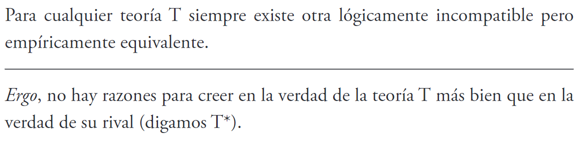 Premisa 1: Toda teoría tiene rivales empíricamente equivalentes (exactamente el mismo conjunto de consecuencias observacionales).