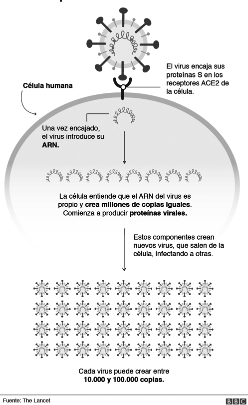 Para estos especialistas, el Covid-19 es una molécula de ácido ribonucléico (ARN) arropada por unas cuantas proteínas que tienen una determinada forma tridimensional y su actividad comienza cuando la forma de esas proteínas que la envuelven encaja con las del exterior de la célula, como una llave en una cerradura. En ese momento el virus ingresa en esa célula hospedadora y es tratado por la célula y leído como propio, dado que la célula “lee” su código. En este código están las instrucciones para generar nuevas copias de ADN vírico, como para codificar y sintetizar otras proteínas o lípidos. Cuando esto ocurra el virus se habrá replicado realizando miles o millones de copias, desatendiendo las labores habituales de la célula que son aquellas que favorecen nuestra vida. De este modo, el virus, además de replicarse de forma desmedida, frecuentemente destruye la célula hospedadora que, en el caso del Covid-19 son las del aparato o sistema respiratorio, como es el caso de los pulmones, hasta producir la muerte del paciente. Como lo dice la BBC (29-03-2020) “[e] l coronavirus, como todos los virus, es básicamente un conjunto de instrucciones -fragmentos del código genético- en busca de células a las cuales invadir para obli-garlos a seguir sus mandatos”, i.e., una molécula de ARN que encaja sus proteínas S en los receptores ACE2 de la célula hospedera, de suerte que una vez encajado, el virus introduce su ARN y ésta entiende que el virus es propio y crea millones de copias iguales y esos nuevos virus salen de la célula e infectan a otras: