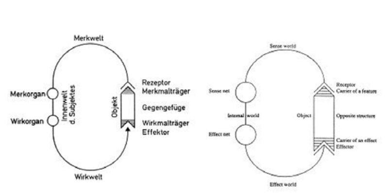 O termo Umwelt pode ser aplicado para destacar as diferentes de percepção e ação no mundo dos organismos vivos. Para Uexküll, todo organismo vivo tem um Umwelt próprio que constitui uma unidade entre “mundo-de-percepção” (ou sistema receptor) e “mundo-de-ação” (ou sistema efetuador). Como o Umwelt consiste em uma forma específica da espécie, diferentes organismos engendram diferentes formas de percepção e ação no mundo. O mundo-de-percepção é composto por tudo o que o sujeito percebe em seu entorno, por meio dos órgãos receptores, o que desencadeia no organismo formas específicas de organizar os conteúdos da experiência sensível. O mundo-de-ação se refere às atividades motoras realizadas por intermédio dos órgãos efetuadores. Em se tratando de atividades cognitivas, as relações entre sujeito e objeto obedecem a uma forma de circularidade funcional entre “mundo-de-percepção” e “mundo-de-ação”. Como se pode observar na ilustração abaixo:
