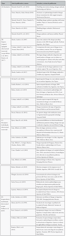 Para lograr el objetivo propuesto se realizó una búsqueda bibliográfica y se seleccionaron todos los trabajos realizados en Argentina desde 1998 (momento de reemergencia del dengue en el país) hasta el 2019 que incluyeran la presencia (empírica o simulada) de casos de dengue. En este sentido, se excluyeron los estudios que solo consideraban como preguntas de investigación diferentes alteraciones en las poblaciones de Aedes aegypti o características referidas a estas, o bien que estudiaran diferentes aspectos del virus. También se excluyeron las revisiones con la finalidad de evitar el discurso generado en torno a la interpretación de trabajos seleccionados en la búsqueda. De esta manera, se recuperaron los estudios que responden a las condiciones esbozadas por Ayres (2005) como necesarias para definir el campo epidemiológico: presentan un análisis colectivo de la enfermedad, utilizan una variación cuantitativa para expresarlo y persiguen un control técnico del evento estudiado. Para realizar la búsqueda se introdujeron como términos libres “Argentina” AND “dengue” en los buscadores académicos PUBMED, SCOPUS, BVS y SCIELO, y se seleccionaron todos los artículos a los que se pudo acceder. Se realizó una revisión sistemática de los trabajos recuperados por las búsquedas y se los clasificó según los diferentes abordajes de estudio sobre el dengue o la población de Aedes aegypti (ejemplo, modelado espacial de la enfermedad o control sobre los mosquitos). La clasificación se logró mediante la lectura de los resúmenes de cada artículo. A la selección realizada se le agregaron otros estudios que cumplían los criterios de inclusión pero que no eran recuperados a través de los buscadores académicos. Estos estudios adicionales se hallaron a través de una exploración en las referencias bibliográficas de los artículos seleccionados en las búsquedas iniciales. La lista de los 31 artículos seleccionados se detalla en la tabla 1. En estos se analizó cómo se caracterizaba a la población, estudiando las maneras explícitas en que esta era determinada y cómo era recuperada de forma implícita en las metodologías utilizadas. En la primera columna se detalla el tipo de estudio epidemiológico, siguiendo para su clasificación la tipología de diseños indicada por Almeida Filho y Rouquayrol (2011). En la segunda columna se indican los autores y el año de publicación. Finalmente, en la tercera columna aparecen los títulos de los artículos y el nombre de la revista en la que fue publicado cada uno.