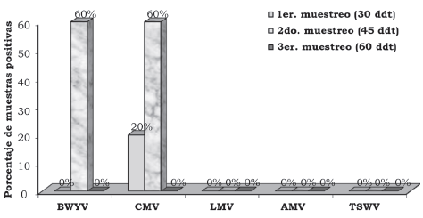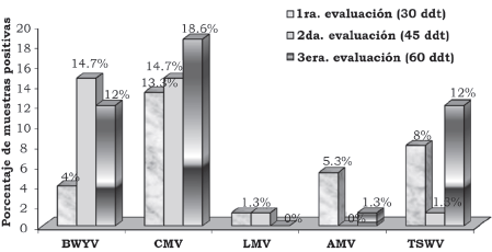 La detección viral se realizó en tres fechas de muestreo, a los 30, 45 y 60 días después del trasplante (ddt). Para integrar la muestra a evaluar, se colectó una hoja de cada una de cinco plantas de la parcela experimental; dependiendo del híbrido evaluado, las plantas podían presentar síntomas presuntivos de una virosis, por ejemplo: enchinamiento, mosaico, amarillamiento, necrosamiento y enanismo, o ser asintomáticas. Cada uno de los cinco experimentos tuvo 15 parcelas o unidades experimentales, a las cuales se les realizaron tres muestreos, dando un total de 225 muestras. Éstas se colocaron en bolsas de plástico y se mantuvieron en congelación (-20 ºC) hasta su procesamiento.