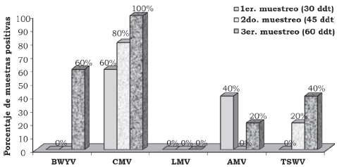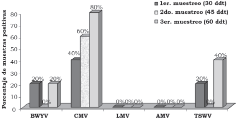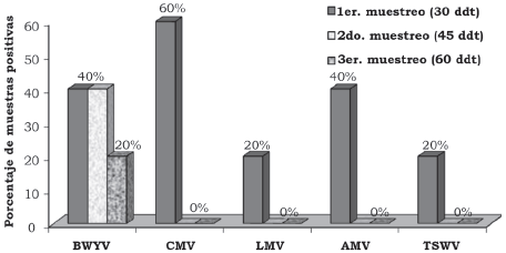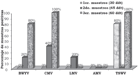 Es importante conocer la frecuencia viral en cada muestreo para determinar de acuerdo con la fecha de plantación cuál es la etapa fenológica de la planta de lechuga en la cual se debe realizar la determinación de los virus presentes, con el fin de llevar a cabo un manejo integrado de las virosis. En el presente estudio, los porcentajes de muestras seropositivas variaron en los diferentes muestreos; lo anterior no significa que los virus hayan desaparecido de las plantas en el periodo transcurrido de un muestreo a otro, sino que posiblemente se haya reducido la concentración viral y, por lo tanto, la prueba de ELISA no lo detectó. Ello coincide con lo reportado por Conci, Canavelli & Lunello (2003), Dovas et al. (2001) y Shiboleth, Gal-On, Koch, Rabinowitch & Salomon (2001), quienes señalan que aunque la técnica de ELISA a menudo ha sido utilizada para realizar el diagnóstico de virus en ajo, la técnica de PCR ha demostrado ser más eficiente y sensible.