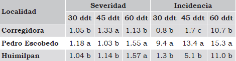 Hubo diferencias altamente significativas para los factores fechas de plantación y localidades a los 30 ddt, 45 ddt y 60 ddt, con coeficientes de variación del 63%, 50% y 68%, respectivamente. La incidencia de virosis fue significativamente mayor en el primer, segundo y tercer muestreo, 6.6a%, 9.4a% y 16.1a% en la segunda fecha de plantación, respectivamente; en comparación con el primer, segundo y tercer muestreo, 1.0b%, 3.5b% y 7.4b% en la primera fecha de plantación, respectivamente (tabla 1). Además, la incidencia de virosis fue estadísticamente mayor en el primer, segundo y tercer muestreo, 9.4a%, 13.4a% y 15.3a% en la localidad de Pedro Escobedo, respectivamente; en comparación con 0.8b%, 1.7c% y 10.7b% y 1.3b%, 5.1b% y 11.0b% en las localidades de Corregidora y Huimilpan, respectivamente (tabla 2).
