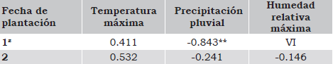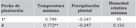 La asociación entre la severidad de virosis del factor fecha de plantación fue positiva y moderada con la temperatura máxima y negativa y altamente significativa con la precipitación pluvial en la primera fecha de plantación, lo cual muestra que a menor precipitación pluvial habrá mayor severidad de virosis (tabla 3). La asociación entre la incidencia del factor fecha de plantación con la temperatura máxima fue positiva, moderada y significativa en la segunda fecha de plantación, lo cual muestra que a mayor temperatura habrá mayor incidencia de virosis en las plantas (tabla 4).