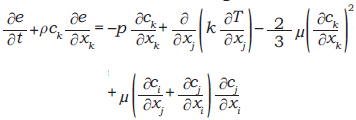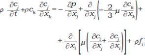 En este punto se requiere conocer el efecto que causan las modificaciones geométricas y el aumento de velocidad angular en el flujo de aire dentro del ventilador, por lo que se crea el modelo de ventilador en el software SolidWorks 2014. Posteriormente, se realiza el mallado del volumen de control utilizando el softwareGambit 2.4.6, obteniendo un total de 1 949 751 sub-volúmenes para el análisis en CFD. Este mallado se evaluó a las condiciones de operación actuales y se comparó con datos experimentales de velocidad y presión estática a la descarga del ventilador. Las mediciones fueron realizadas por la planta termoeléctrica en la descarga del ventilador utilizando un tubo de Pitot modificado, el cual es capaz de tomar varias lecturas de presión en la sección de interés. El área transversal rectangular considerada fue de 5.5 m2 (2.5 m x 2.2 m). Los valores medidos fueron: velocidad de 21.98 m/s, presión estática de 5.003 kPa, temperatura interior de 38.6 °C y temperatura exterior de 29.4 °C. Con estos valores se determinó el flujo másico en la descarga igual a 136 kg/s. El modelo numérico se evaluó con el mismo flujo másico, el cual fue dividido en dos, ya que el ventilador presenta doble aspiración, obteniéndose una presión estática en la descarga de 5.061 kPa y una velocidad de 25.09 m/s; arrojando un error de 1.16% y 14.15% para la presión y la velocidad, respectivamente, por lo que el modelo numérico es adecuado para el estudio del ventilador, asegurando con esto un proceso de cálculo relativamente rápido. Se procede a colocar las condiciones de contorno de entrada y salida del flujo así como determinar los volúmenes y paredes que estarán en rotación (volúmenes y paredes correspondientes a superficies de álabes y placas de soporte fijas a la flecha con movimiento), al igual que los volúmenes y paredes fijos (paredes de los ductos de entrada de flujo y paredes de la carcasa); finalmente, se establece el método de solución para resolver el análisis. Las ecuaciones de gobierno en forma tensorial usadas en este trabajo se indican a continuación.