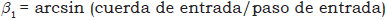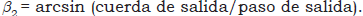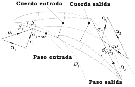 Para la estimación de los ángulos β1 y β2 se trazan dos líneas denominadas cuerda y paso. Las cuerdas son perpendiculares al álabe, ya que parten del inicio de este hacia la superficie del siguiente álabe, como se aprecia en la figura 5. Se tiene entonces que: