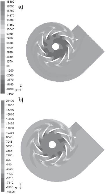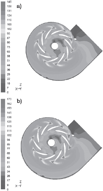 Como resultado de las simulaciones por volumen finito, en las figuras 9 y 10 se representan dos de los contornos más relevantes: el de presión total y la distribución de velocidad. La figura 9 ilustra los contornos de la presión total del fluido circundante a los álabes. En la figura 9a se puede apreciar el aumento de presión en el rotor por el movimiento del fluido y el incremento de presión que ocurre en el caracol de la carcasa debido al incremento en el área de la sección transversal. A pesar de que en la descarga de los álabes se aprecian ligeramente valores de presión más elevados respecto a la velocidad de rotación de 1185 rpm (figura 9b); las presiones más negativas debajo de los álabes indican un cambio de energía potencial a energía cinética más pronunciado.