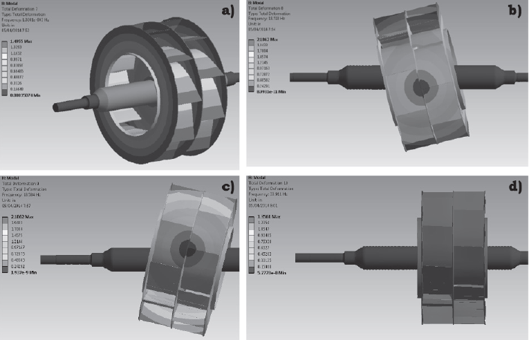 Como se puede observar en la tabla 4, las frecuencias naturales para los modos 2 y 3 están por debajo de la frecuencia de operación de 19.75 Hz (1185 rpm), mientras que para el modo 1 la frecuencia es cercana a cero, el modo 4 corresponde a 33.91 Hz (2035 rpm) con 850 rpm por encima de la velocidad de operación. En la figura 12 se ejemplifican los modos de vibración, representando los puntos más relevantes.