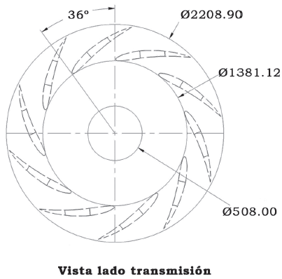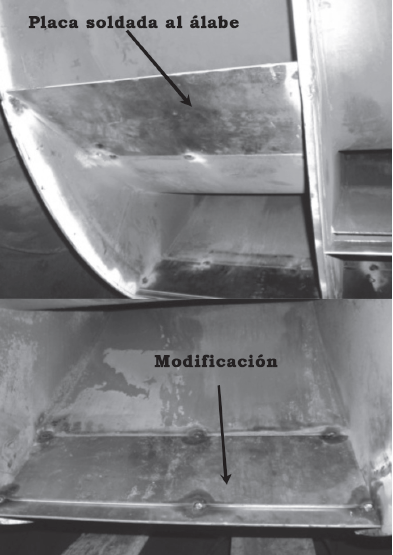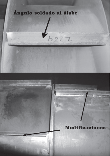 Con base en la experiencia y acciones que ha tomado el personal de la planta en este tipo de equipos, se desarrollaron propuestas de modificación geométricas con el objeto de alcanzar un flujo deseado. En la figura 2 se puede apreciar la primera propuesta, la cual consiste en el incremento del álabe mediante la colocación de ángulos en la parte final del mismo. En la imagen de la izquierda se observa un detalle de la colocación del ángulo al final del álabe, y en la imagen de la derecha se observa el ángulo colocado en cada uno de los álabes. Es importante mencionar que lo único que se modificó fue el diámetro exterior de los álabes; el resto de las dimensiones permaneció sin cambio alguno. El diámetro exterior antes de las modificaciones era de 2.05 m (2050 mm).