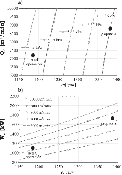 En la figura 6a se puede apreciar que para una velocidad de giro constante del rotor, las caídas de presión al variar la carga de operación son poco significativas, por lo que al incrementar las revoluciones del rotor la presión a la descarga no presentaría afectaciones que comprometan drásticamente el funcionamiento del ventilador. Finalmente, la variación de los parámetros anteriores está directamente relacionada con la potencia demandada en el motor. La figura 6b muestra este comportamiento, donde la operación actual representa una potencia de 1100 kW, y la operación para cumplir con el flujo y presión de diseño es de 1780 kW; esto es aproximadamente un 60% mayor a la condición de diseño. En la tabla 1 se muestra un resumen de las condiciones operacionales actuales y las propuestas en el ventilador. Las condiciones se proponen para cumplir con el objetivo de incrementar el flujo hasta 8800 m3/min, y así suministrar el flujo requerido en la cámara de combustión para operar el ciclo de potencia a una carga del 100%. Los resultados mostrados en la tabla 1 indican que para lograr el flujo deseado se debe incrementar la potencia del motor en un 61.8%, la velocidad de rotación en un 25.45%, y con ello asegurar el tiro adecuado para lograr el flujo lado gases, incrementando la presión a la descarga del ventilador en un 37.2%. A pesar de los incrementos resultantes, las modificaciones resultaron simples y de muy bajo costo en comparación con otras alternativas.