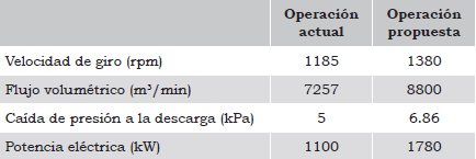Se expusieron nuevas condiciones de operación para el ventilador propuesto, ocasionando el uso de un motor de mayor capacidad al actual, con el objeto de alcanzar una velocidad de 1380 rpm y una presión en la descarga de 6.86 kPa para un flujo volumétrico de 8800 m3/min.