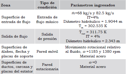 En la tabla 2 se muestra un compendio de los parámetros ingresados para configurar el caso actual (referencia) a 1185 rpm y la velocidad propuesta a 1380 rpm (figura 6). La intensidad de turbulencia se estima como IT = 0.16/Re1/8; para todos los casos se calculó una intensidad de turbulencia promedio a 2.5%, pero en estos cálculos se considera que el fluido a la entrada no presenta filtros de aire, los cuales ocasionan turbulencia en la entrada; para considerar este efecto se incrementó la turbulencia hasta 4% en la entrada y salida del volumen de control. El modelo de turbulencia usado fue el modelo k-e por su amplia aplicabilidad en el estudio de fenómenos físicos y su bajo costo computacional.
