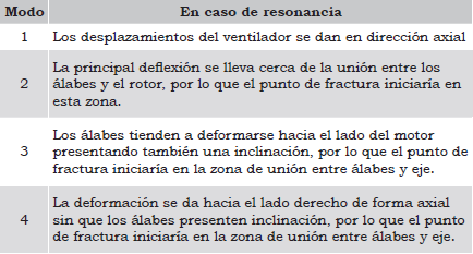 Para determinar las velocidades críticas de operación del ventilador se realizó un análisis de frecuencias naturales y modos de vibración, en el cual se extrajeron 30 modos de vibración para un rango de frecuencia lo bastante amplio. Para fines prácticos solo se presentan las frecuencias naturales cercanas a las frecuencias de operación de 19.75 Hz y 23 Hz correspondientes a las velocidades de operación analizadas de 1185 rpm y 1380 rpm, respectivamente, mostradas en la tabla 4.