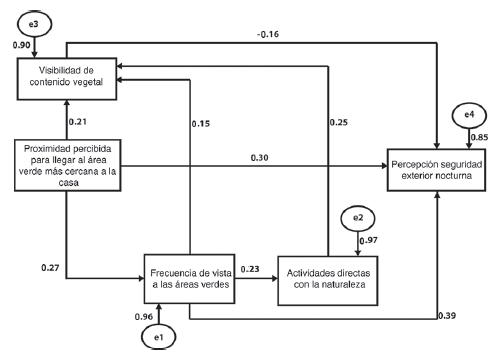 Como se observa en la figura 2, varios caminos impactan la percepción de seguridad nocturna considerando de manera inicial a la proximidad percibida para llegar al área verde más cercana a la casa (0.30). Dentro de las relaciones cabe destacar el rol mediador de la variable frecuencia de visita a las AV fuera de casa en la relación NUP (proximidad percibida para llegar al área verde más cercana a la casa) y la percepción de seguridad exterior nocturna. También se observa que la proximidad percibida para llegar al AV más cercana a la casa se vincula positivamente con la visibilidad de contenido vegetal (0.21), y esta a su vez negativamente con la percepción de seguridad exterior nocturna (-0.16). De manera que, a menor visibilidad de contenido vegetal, mayor percepción de seguridad exterior nocturna. En el diagrama se observa el impacto de las variables frecuencia de visita a las áreas verdes (0.15) y las actividades con la naturaleza (0.25) en la visibilidad de contenido vegetal en dirección opuesta a lo esperado.