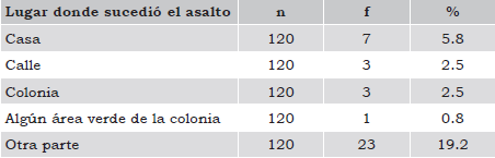 = 0.75) y nueve reactivos con un formato de respuesta (0) muy inseguro hasta (3) muy seguro. La escala evalúa la seguridad percibida en la calle, colonia y el parque más cercano a la colonia durante el día, la noche y los fines de semana. De igual modo, se preguntó a los participantes si habían sido asaltados alguna vez en su vida y, en caso afirmativo, la ubicación de dicho episodio.