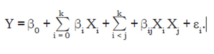 Donde Y es la respuesta, Xi , Xij las variables independientes y su interacción, es el coeficiente constante, , y son los coeficientes lineales y de interacción, respectivamente, que evalúan los efectos. El modelo empleado se utilizó para evaluar el rendimiento, aplicando análisis de varianza (ANOVA).