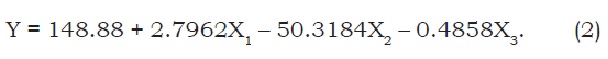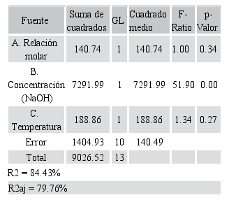 El análisis de varianza (ANOVA) aplicado a la matriz de resultados (tabla 3) mostró que el factor concentración del catalizador (NaOH) indicó un efecto significativo sobre el rendimiento (p < 0.01), a diferencia de los factores de temperatura y relación molar. De igual forma, no se presentó un efecto de interacción entre estos factores y no se tomaron en cuenta en el modelo polinomial de ajuste, con la finalidad de mejorar el coeficiente de correlación. Por tanto, el rendimiento de biodiesel crudo está representado por la ecuación 2, donde X1 es relación molar, X2 es concentración del catalizador NaOH y X3 es la temperatura.