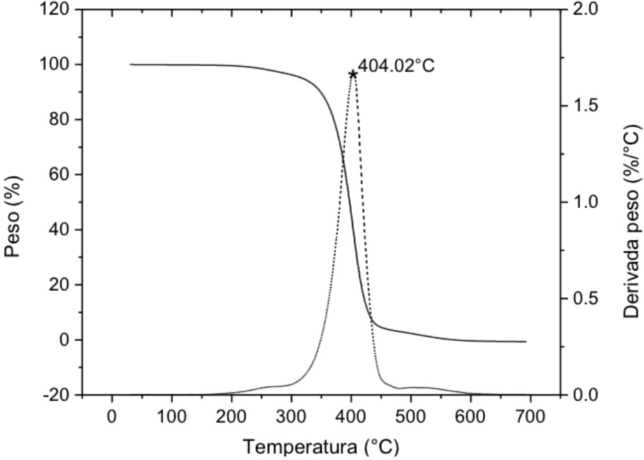 La degradación térmica del aceite bajo condiciones no isotérmicas (figura 1) mostró un solo peldaño en la pérdida de masa en el rango de temperatura ambiente a 700 ºC, rango en el cual se registra una pérdida en peso de aproximadamente de 95.43% a una temperatura promedio de 404.73 °C, atribuida a una única sustancia o una mezcla con pequeñas diferencias de masas moleculares, tal como sugiere De Oliveira et al. (2007).