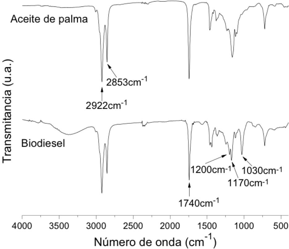 En el espectro FT-IR del aceite crudo de palma producido en Tabasco (figura 2) y el biodiesel se pueden apreciar en bandas indicando la presencia de los enlaces simétricos y asimétricos de C-H alrededor de 2800 cm–1 y 3000 cm–1. De forma particular, el pico a 2922 cm–1 es una característica de los aceites vegetales, así como del biodiesel que corresponde a grupos metilo, y también se observa una banda en 1743 cm–1 característica de ésteres ácidos y ésteres de grasa. Las diferencias entre ambos espectros es la intensidad en los picos antes mencionados.