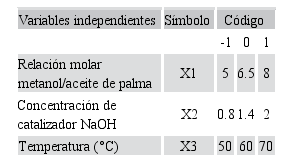 Lo antes descrito permite establecer que el actual estatus de conocimiento sugiere que la reacción de transesterificación es difícil de generalizar y debe ser analizada caso por caso. Por ello, la finalidad de este trabajo fue evaluar las variables que influyen en el rendimiento del biodiesel a partir de aceite crudo de palma (Elaeis guineensis Jacq.), como son la concentración de catalizador (NaOH), la relación molar metanol-aceite (RMA) y la temperatura del medio de reacción. Para lograr el objetivo se propuso un diseño factorial 23 con seis puntos centrales, que permitió estudiar el efecto de cada factor sobre la variable de respuesta (rendimiento de biodiesel crudo), así como el efecto de las interacciones entre factores sobre dicha variable, además de implementar la metodología de ruta ascendente para encontrar los valores óptimos.