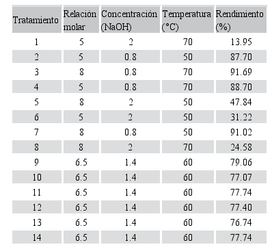 En la tabla 2 se reporta el rendimiento de biodiesel crudo obtenido mediante los tratamientos con base en la aplicación del diseño factorial 23 y puntos centrales que conllevó a realizar 14 reacciones de transesterificación completamente aleatorizadas. Los resultados en las reacciones bajo las condiciones propuestas mostraron rendimientos en el intervalo del 10% al 90%.