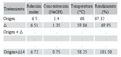 Por lo tanto, el modelo fue seleccionado para predecir el rendimiento, y dado que los resultados de dos tratamientos mostraron valores aproximados al 91%, se procedió a incrementar este valor. Otros estudios han evaluado las variables de respuesta de producción de biodiesel con diseños factoriales y aplicando metodología de superficie de respuesta (Betiku & Folorunsho-Adepoju, 2013; Mazo, Restrepo, Ríos & Marín, 2008), modelando polinomios de segundo orden con curvatura en las respuestas. Por ejemplo, los estudios de Betiku & Folorunsho-Adepoju (2013) implican significancia (p < 0.05) en orden de importancia de la relación molar, concentración de catalizador, tiempo y temperatura de reacción, presentándose efectos de interacción.