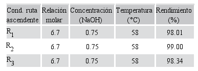 En el modelo polinomial obtenido en este estudio, la curvatura del modelo solo es explicada por este efecto de interacción. Esto último explica que la mayor contribución al modelo sea por los efectos lineales y la posibilidad que modelos más complejos contribuyan a incrementar ligeramente el valor del coeficiente de correlación. Por lo anterior, es mejor aplicar un método en ruta ascendente como un procedimiento eficiente para moverse de forma secuencial en la dirección del incremento máximo de la respuesta (Gutiérrez & De la Vara, 2008; Montgomery, 2004). En este caso, se tienen tres variables independientes, y puesto que X2 tiene el coeficiente de regresión más grande (ecuación 2), es el factor adecuado como variable de paso. Los resultados para el pronóstico de rendimiento (tabla 4) mostraron incrementos graduales a un paso de 0.5, seleccionándose el más consistente con la realidad para llevar a cabo el experimento (Origen + Δ14). Los experimentos realizados con base en el método de la ruta ascendente (tabla 5) arrojaron resultados de la variable de respuesta cercanos al 100%, por ello las condiciones de RMA 6.7:1, concentración de NaOH de 0.75% y 58 °C de temperatura de reacción, resultan óptimas para obtener altos valores en rendimiento de biodiesel crudo.